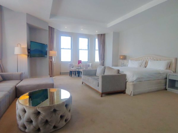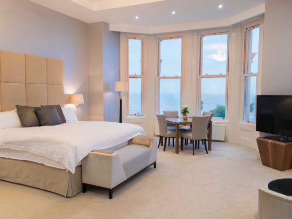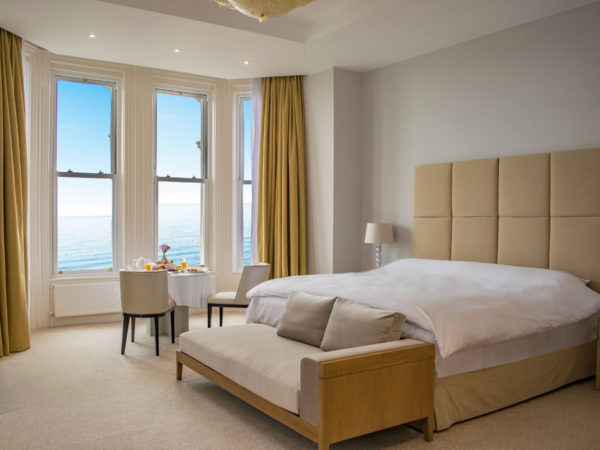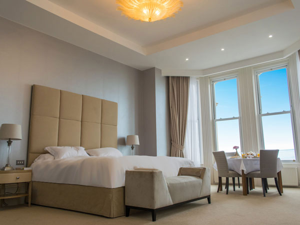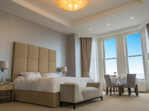 Our exceptional suites bring together the past and present in this magnificent Victorian hotel. Each spacious suite measures at least 60sqm (645sqft), has an enormous Emperor size bed, a dining table in one of the two bay windows, a large sofa bed, a 50 inch Smart television Netflix, Amazon Prime and many other apps and channels. The bathrooms have double jacuzzi baths and walk in rain showers. Exquisite furniture, sumptuous furnishings, spacious wardrobes and breathtaking sea views complete the picture and will ensure you unwind from the moment you arrive.